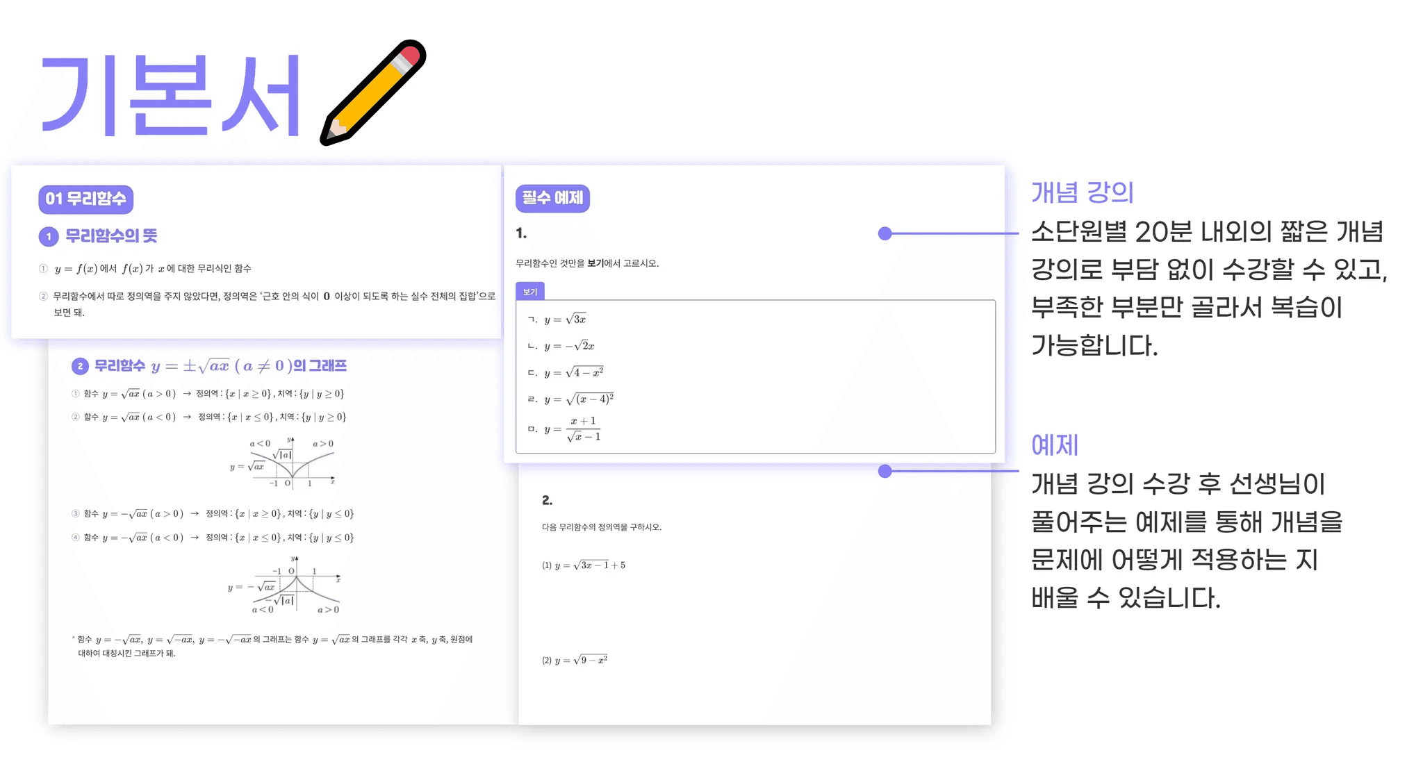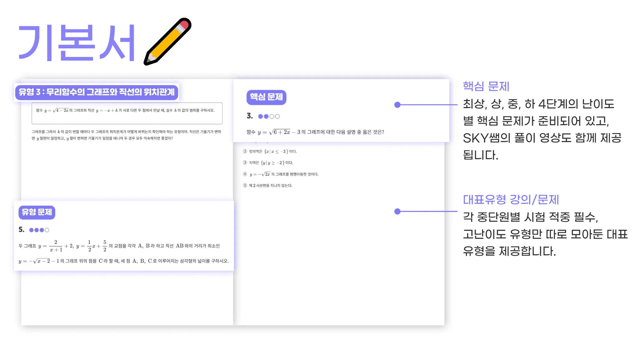개념 강의, 예제, 핵심 문제 3단계로 구성. 여기에 대표