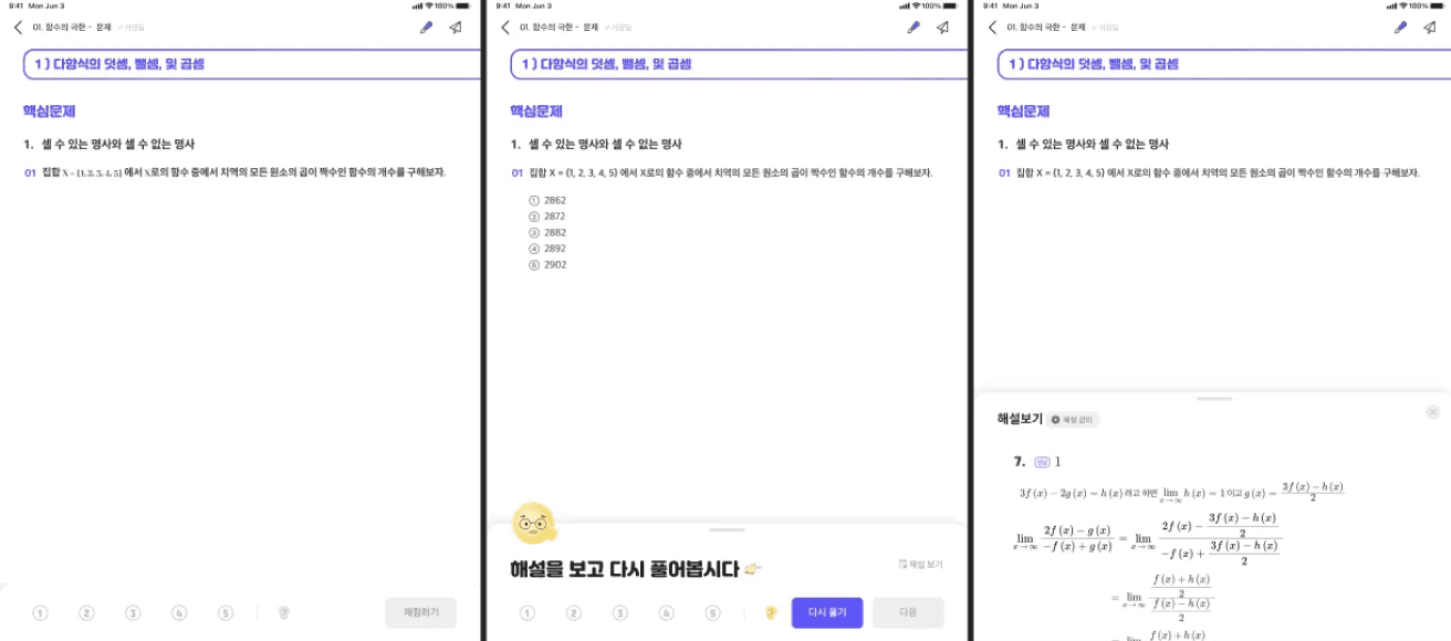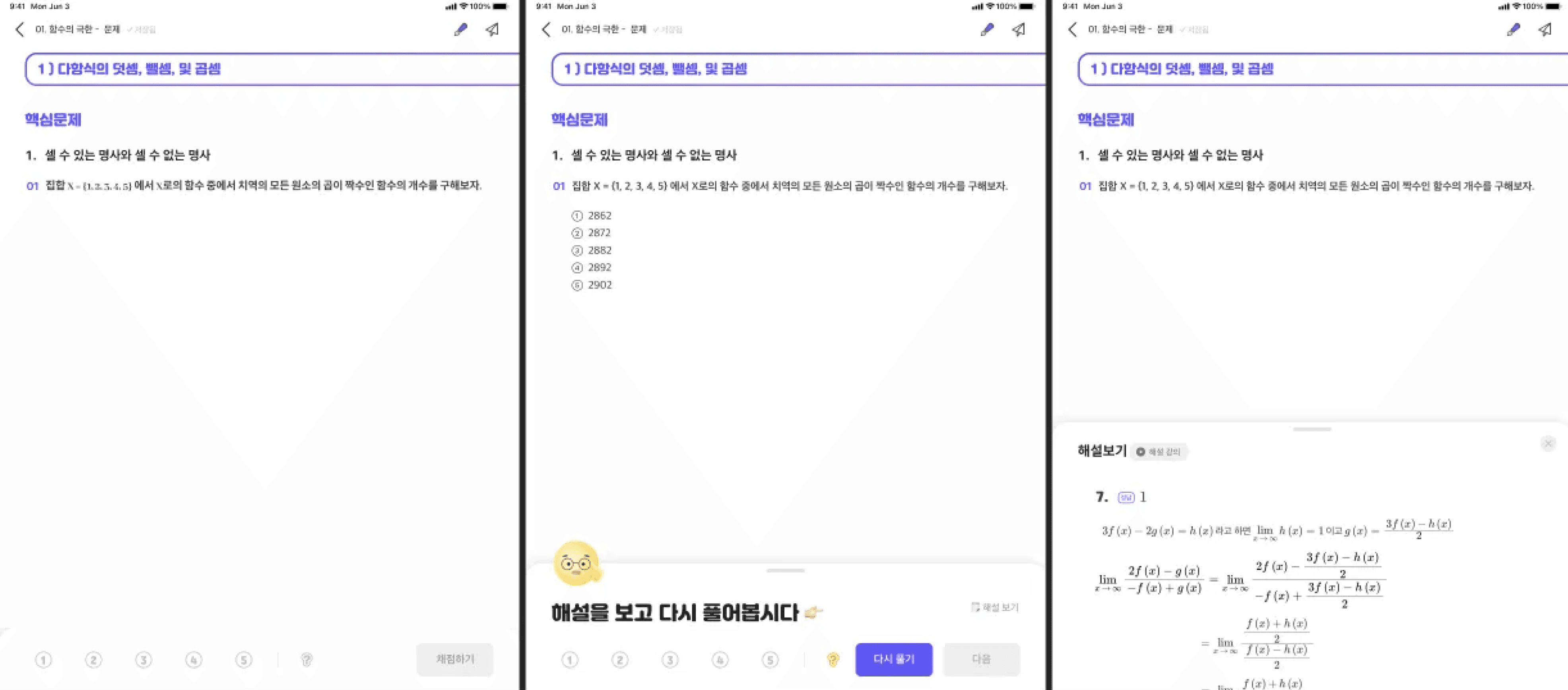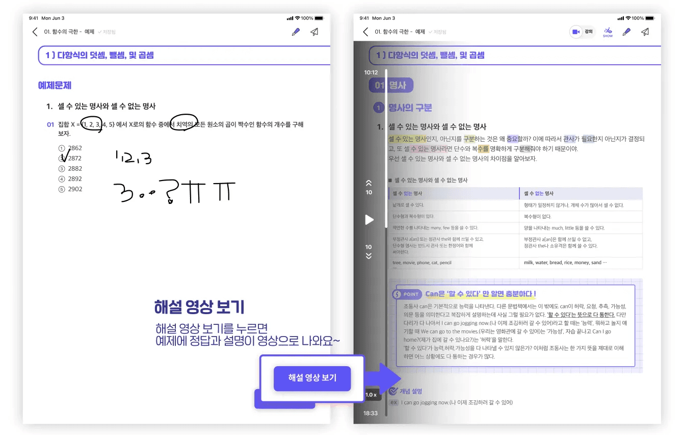예제를 먼저 풀어보고 해설 영상으로 선생님은 어떻게 풀었는지 확인 가능