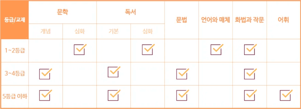 어휘, 문학 개념, 독해 전쟁Basic, 독서 기본, 독서 심화, 문법, 화법과 작문, 언어와 매체 (오픈)