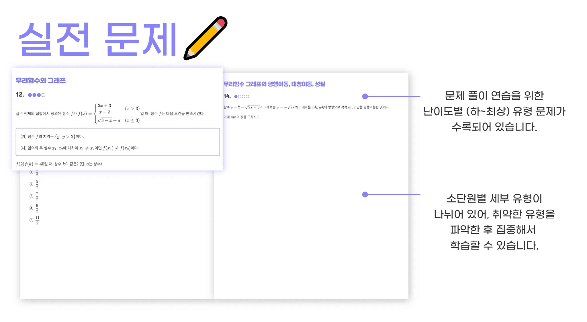 개념 강의, 예제, 핵심 문제 3단계로 구성. 여기에