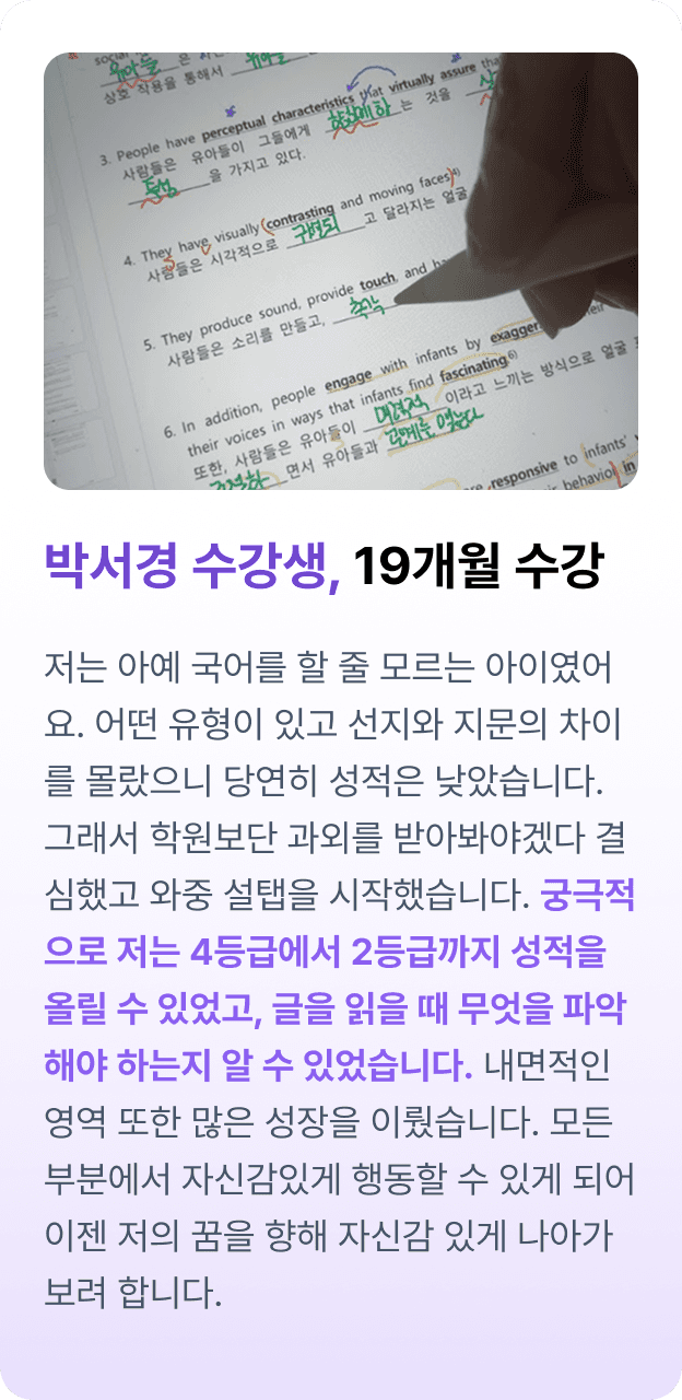 궁극적으로 저는 4등급에서 2등급까지 성적을 올릴 수 있었고 다양한 국어 기법을 학습하며 글을 읽을 때 무엇을 파악해야 하는지 알 수 있었습니다. 내면적인 영역 또한 많은 성장을 이뤘습니다. 모든 부분에서 자신감있게 행동할 수 있게 되어 이젠 저의 꿈을 향해 자신감 있게 나아가 보려 합니다.
