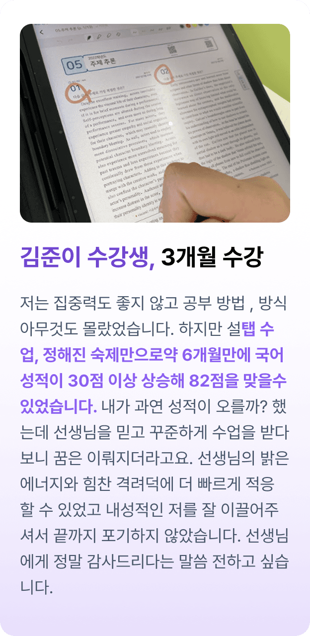 를 받았지만, 고등학교에 올라가면서 국어 성적이 5등급에서 벗어나지 못했어요. 하지만, 설탭을 시작한 후