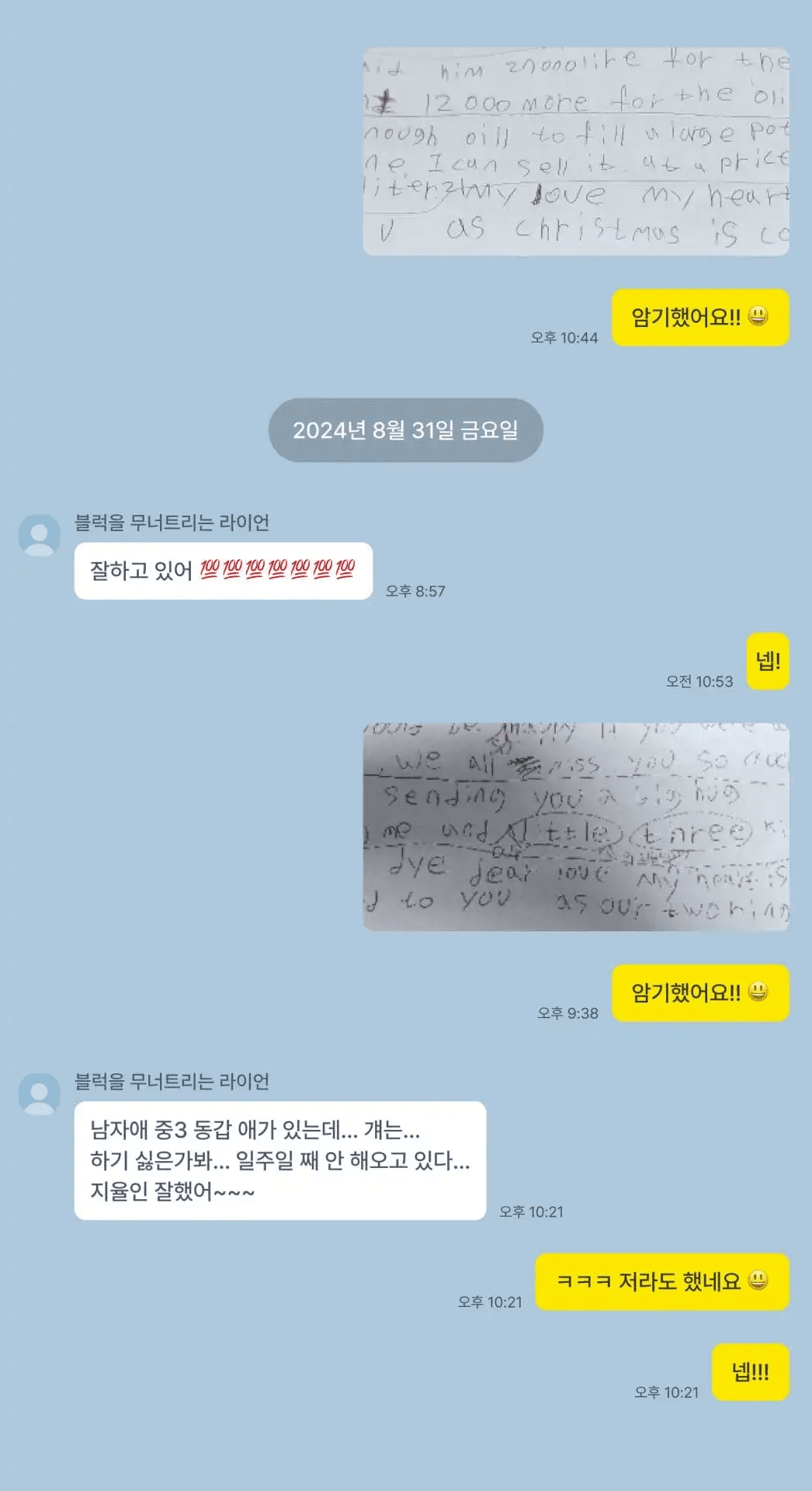 지율이는 기본만 다졌을 뿐인데 한 달 만에 영어 시험에서 20점 이상, 60점대에서 80점대까지 점수를 올릴 수 있었어요. 이전의 시험지를 지금 보면 ‘이렇게 쉬운 거였나?’ 싶을 정도로 영어 실력 변화가 컸죠. 그때 지율이는 ‘개념이 이렇게 중요한 거구나’ 느낄 수 있었대요. 또한 주 1회 수업임에도 불구하고 영어 쌤과는 짧은 시간 동안 무척 가까워졌다고 하는데요.